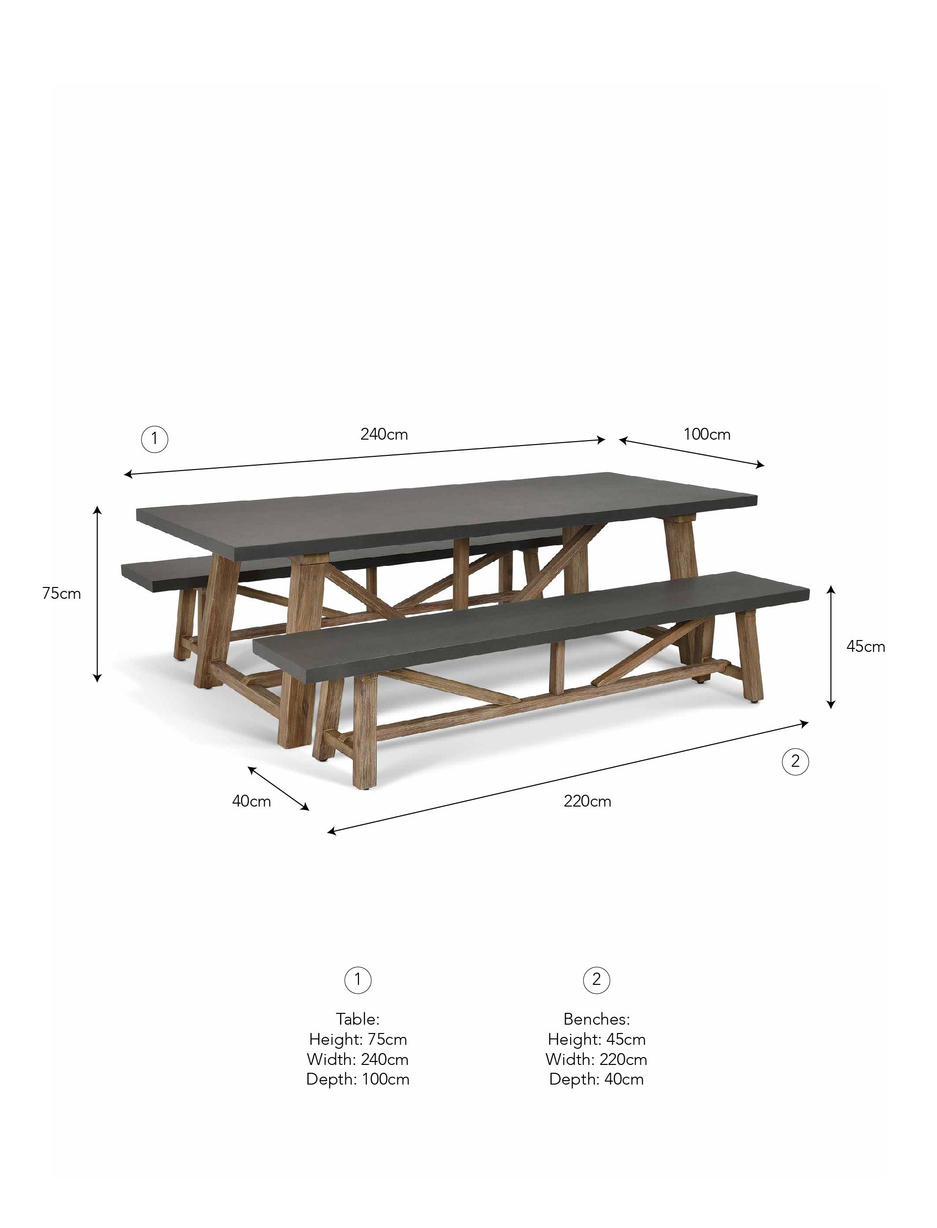 Benches: H45 x W220 x D40cm